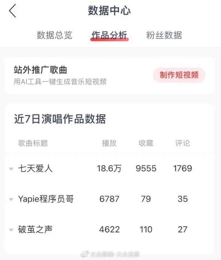 Yapie发布在某音乐平台的作品数据。图源/受访者供图