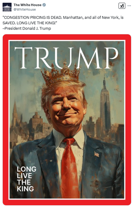 此前,特朗普政府于周三宣布叫停纽约市有争议的拥堵收费计划,白宫在X上的官方账号随后发帖称:“拥堵收费已死。曼哈顿和整个纽约都得救了。国王万岁!”并配了一张特朗普头戴王冠的图片。