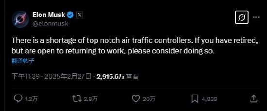 马斯克在社交平台X上写道:“顶尖的空中交通管制员短缺。如果你已经退休,但愿意重返工作岗位,请考虑这样做。”