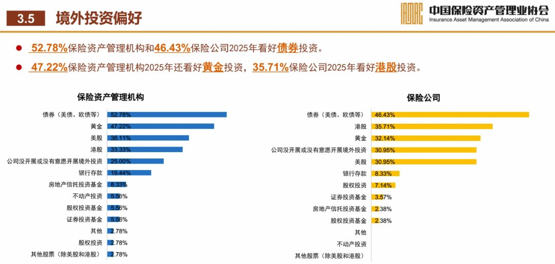 境外投资方面,债券投资2025年受到保险机构青睐,同时有四成保险机构还看好黄金投资和港股投资。