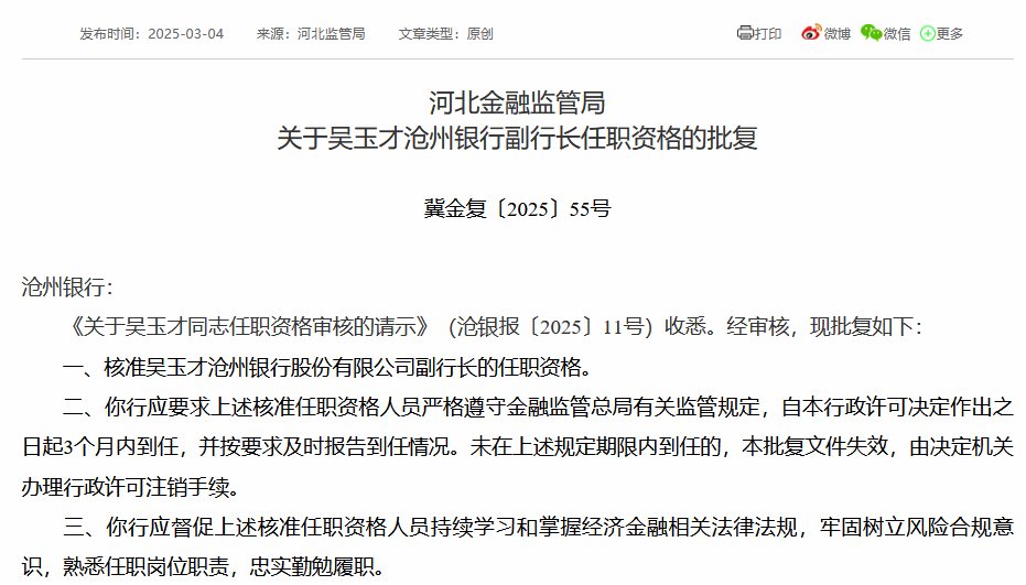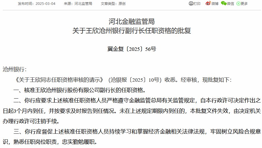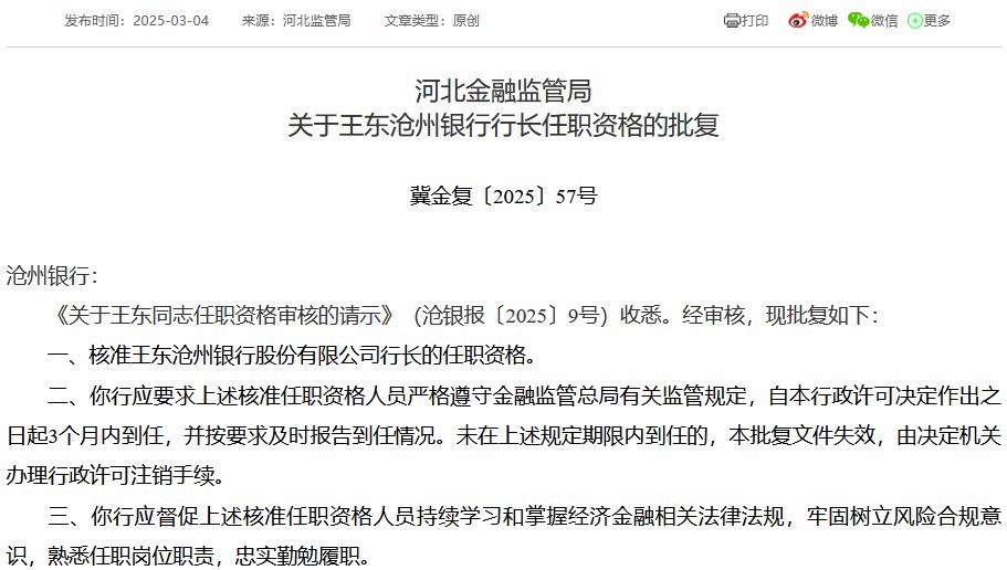 3月4日金融一线消息,河北金融监管局连发三张行政许可批复,核准王东沧州银行行长的任职资格,王欣、吴玉才沧州银行副行长的任职资格。