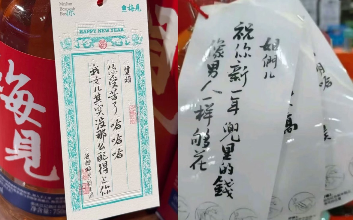 据网友发布的帖子,梅见的新年包装上,写着“贤婿,你受苦了,哈哈哈,我女儿其实没那么配得上你。爸赠梅见新年酒”、“姐们儿,祝你新一年兜里的钱像男人一样够花”等文字,引发巨大争议。