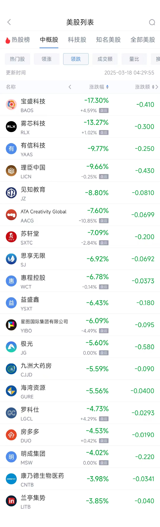 领跌中概股列表: