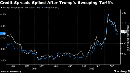 特朗普当选后,美国信用市场最初一片欣欣向荣。去年11月,美国优质公司债的风险溢价降至1998年以来最低水平。但好景不长,在特朗普全面推进关税计划后,债券市场遭遇自疫情爆发以来最严重的一轮抛售。