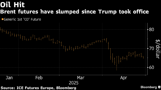 布伦特原油期货价格在4月初曾跌至每桶58.40美元,目前已回升至约65美元。