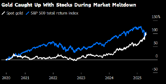 在这场动荡中,黄金是少数受益资产之一,自去年11月5日特朗普胜选以来连续28次创下历史新高。最初,由于市场担心黄金可能被纳入特朗普关税名单,美国黄金期货价格飙升并带动全球金价上涨,交易员争相在征税前将黄金运回美国。