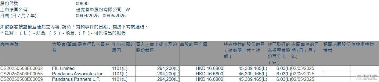 格隆汇5月9日丨根据联交所最新权益披露资料显示,2025年5月2日,途虎-W(09690.HK)获FIL Limited在场内以每股均价16.68港元增持29.42万股,涉资约490.73万港元。