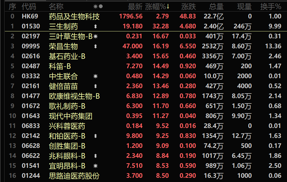 受此提振,香港股市生物医药板块今日迎来集体大爆发。三叶草生物-B,荣昌生物、基石药业、科笛、中生联合等涨幅巨大。