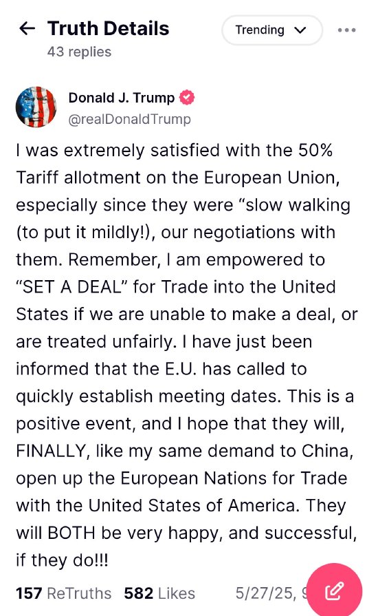 美国总统特朗普在社交媒体发文称,对向欧盟征收50%的关税表示非常满意。