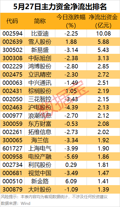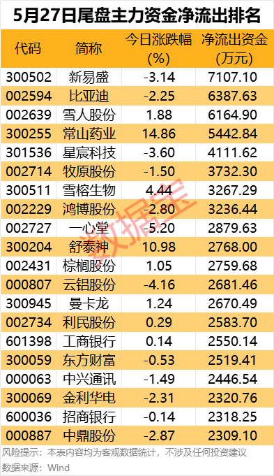 新易盛尾盘主力资金净流出居首,金额为7107.1万元。此外,比亚迪、雪人股份、常山药业(300255)、星宸科技、牧原股份(002714)等净流出金额居前。