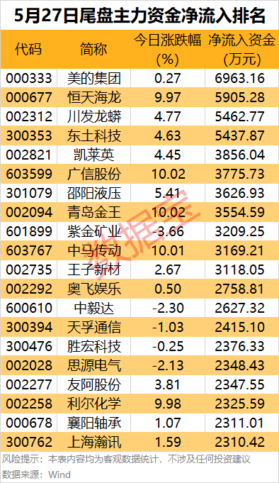 美的集团尾盘净流入金额居首,达6963.16万元;恒天海龙(000677)、川发龙蟒、东土科技(300353)尾净流入金额居前,均超5000万元。
