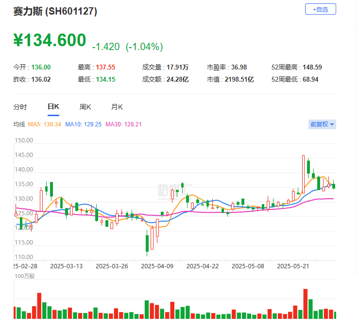 格隆汇6月3日|赛力斯:赛力斯汽车5月销量36450辆,同比增长13.19%。1-5月累计销量108788辆,同比减少22.92%。1-5月问界M9累计销量50,500辆,累计同比增长19.46%。