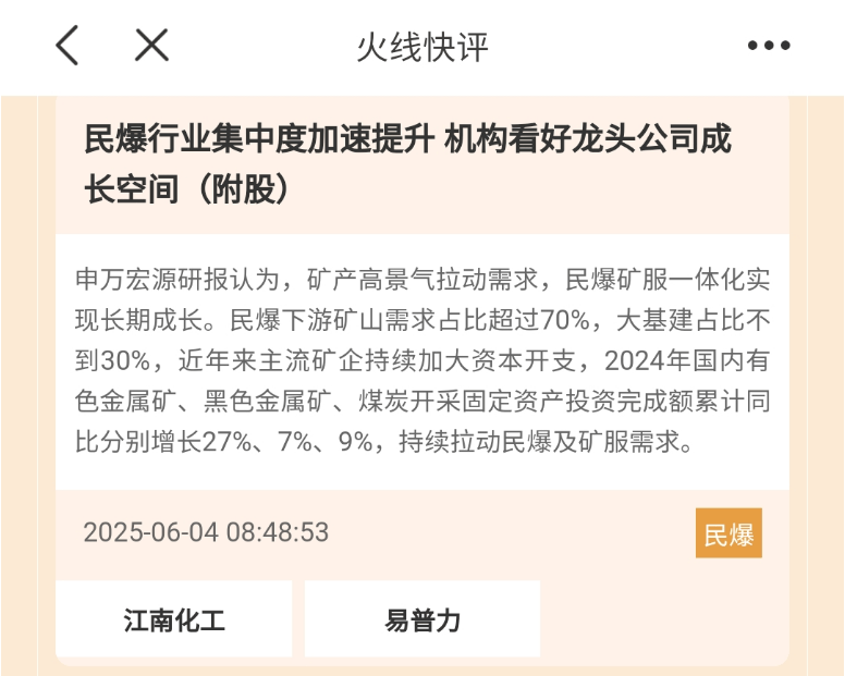 在每日经济新闻App私人订制的“火线快评”中,周三开盘前就提到了民爆板块。相关个股易普力在周五上午盘中冲击涨停。周五开盘前,提到了白银板块,相关个股盛达资源涨停。