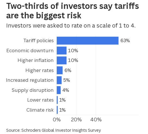 英国投资管理公司施罗德(Schroders)发布的一项调查显示,近三分之二(63%)的机构投资者和财富管理公司认为,贸易关税是影响其战略的最重要的宏观经济问题,是排名第二的经济衰退(10%)的6倍多。
