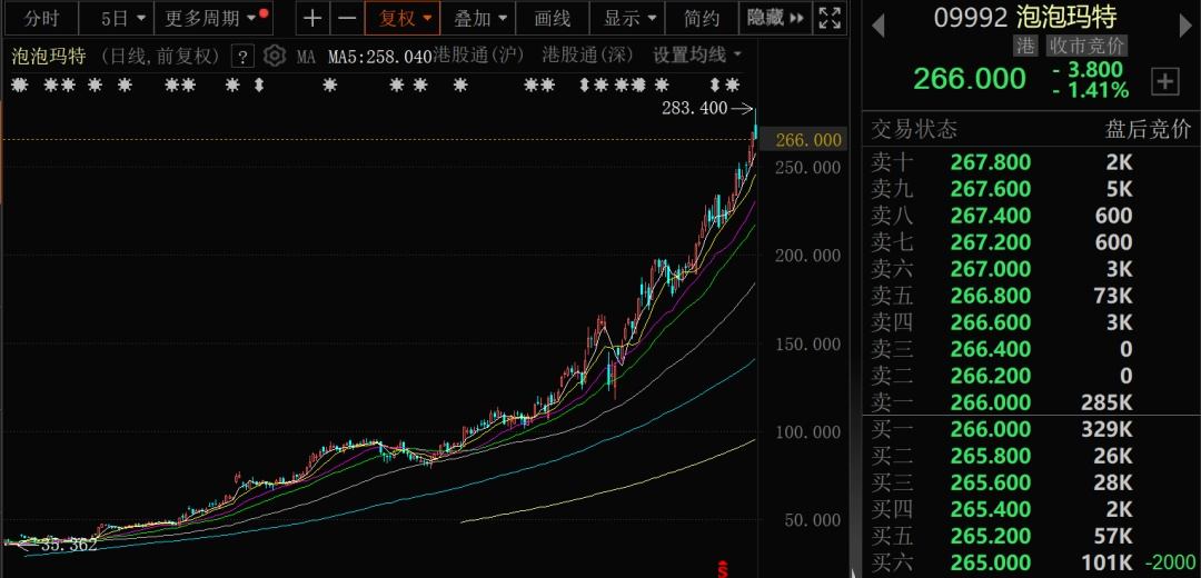 Labubu引发全球现象级热潮,在全球各地引发排队热潮。随着蕾哈娜、贝克汉姆等越来越多的明星在社交媒体上晒出Labubu产品,热度被进一步推高。泡泡玛特股价因此连续上涨,今日盘中再度创历史新高,最高摸至283.4港元/股,今年以来累计飙升逾200%。