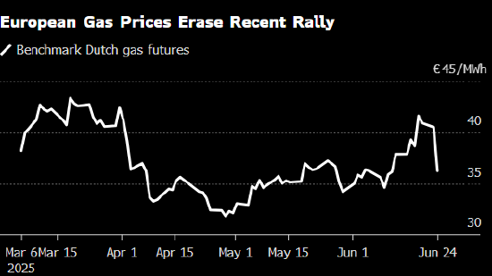 欧洲天然气价格下跌,以色列和伊朗似乎正在遵守美国总统唐纳德·特朗普宣布的停火协议,此前双方曾被指控违反该协议。