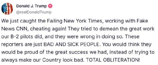 美国总统特朗普发文怒斥:“我们刚刚发现《纽约时报》这帮败类又在跟假新闻CNN勾结,又在作弊!他们试图贬低我们B-2飞行员的杰出贡献,他们这样做是错的。” 特朗普称“这些记者简直是坏人,简直是病态。” 他再次强调打击结果是“彻底摧毁!”