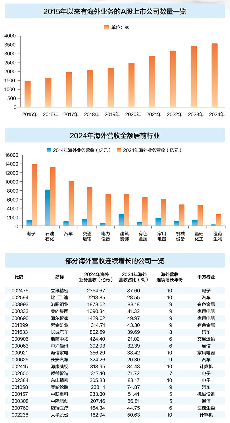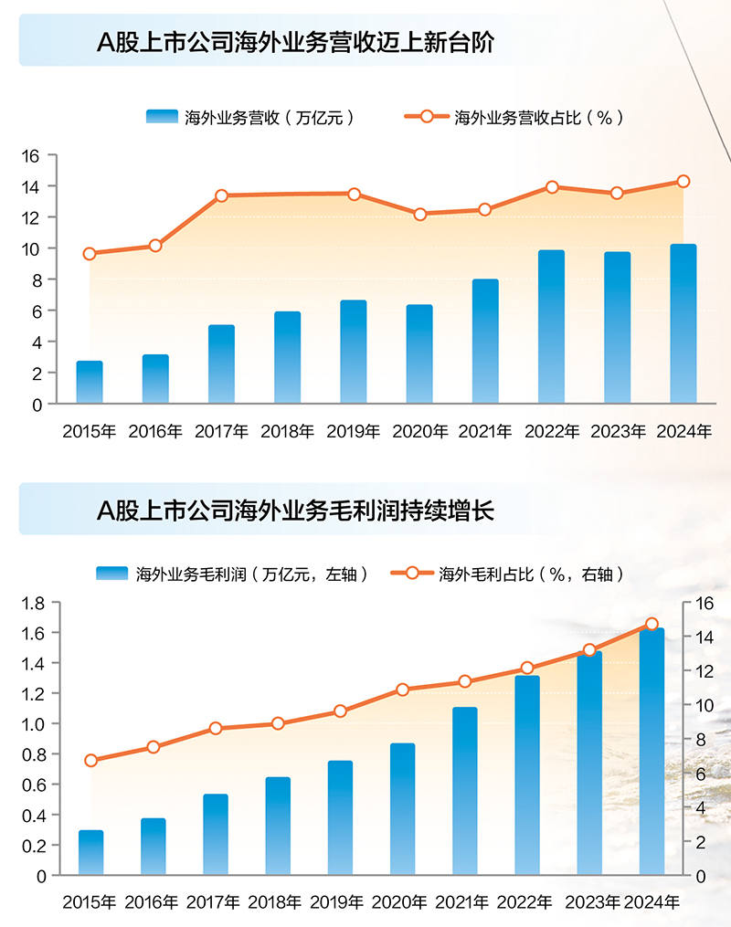 据证券时报・数据宝统计,2024年有海外业务的A股上市公司数量超过3560家,数量占比达到66.37%,两项数据均创历史新高。越来越多的上市公司积极融入全球市场,海外业务成为推动业绩增长的重要引擎。2024年A股公司海外业务营收突破10万亿元,相比十年前增长2.8倍;2024年A股公司海外业务占总营收的比例达到14.28%,创历史新高,与十年前相比,占比提升4.65个百分点。不仅如此,上市公司出海业务毛利润也呈现大幅增长趋势,2024年海外业务毛利润达到1.63万亿元,相比十年前增长8.33倍;海外业务毛利润占总体毛利润的比例达到14.71%,相比十年前提升8个百分点,这是海外业务毛利占比首次超过海外营收占比。