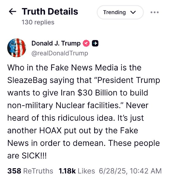 特朗普表示:“哪个混蛋捏造出‘特朗普想给伊朗300亿美元建设非军事核设施’这种事?从没听说如此荒谬的想法,这只是假新闻媒体为了贬低我编造的骗局。这些人简直有病!!!”
