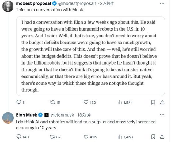 马斯克是在回应一位用户分享的他和硅谷“风投教父”彼得·蒂尔的一段对话。马斯克告诉蒂尔,美国10年内将有10亿个人形机器人。蒂尔说,如果是那样的话,马斯克就不需要担心预算赤字了,因为我们将会有如此大规模的经济增长,增长将会解决这个问题。