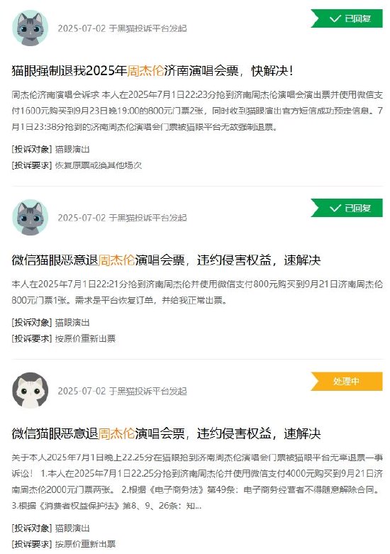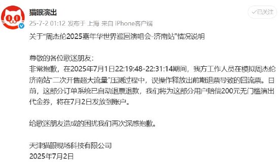 7月1日晚10时许,有网友在猫眼意外发现周杰伦济南演唱会释放大量张门票“回流票”,但是在成功支付约1小时后,却被强制退票退款,且页面中“济南站”已被下架无法再次购买。7月2日凌晨,猫眼演出发布官方声明表示,2025年7月1日22:19:48至22:31:14期间,平台工作人员在模拟周杰伦济南站“二次开售超大流量”压测过程中,误操作释放出前期退票导致的回流票。目前,这部分订单系统已自动退票退款。将为这部分用户赔偿200元无门槛演出代金券,将在7月2日发放到账户。