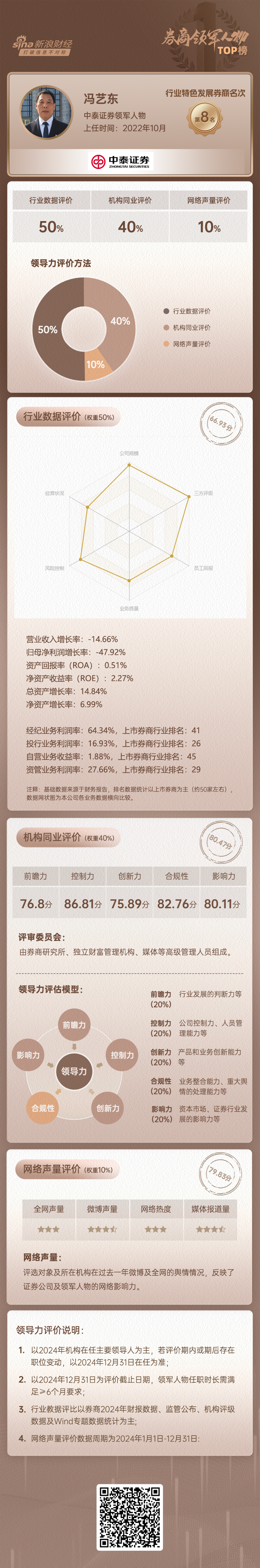 按照上述方法,中泰证券冯艺东行业数据评价总得分为66.93分,在50家上市券商中排名第41名,在9家参评行业特色发展券商中排名第9名。