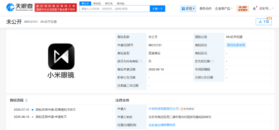 新浪科技讯 7月11日下午消息,天眼查知识产权信息显示,近日,小米科技有限责任公司申请注册“小米眼镜”商标,国际分类为科学仪器,当前商标状态为等待实质审查。据媒体报道,今年6月,小米集团创始人、董事长兼CEO雷军发布了小米眼镜AI Glasses,可实现扫码支付、翻译、拍照等功能。