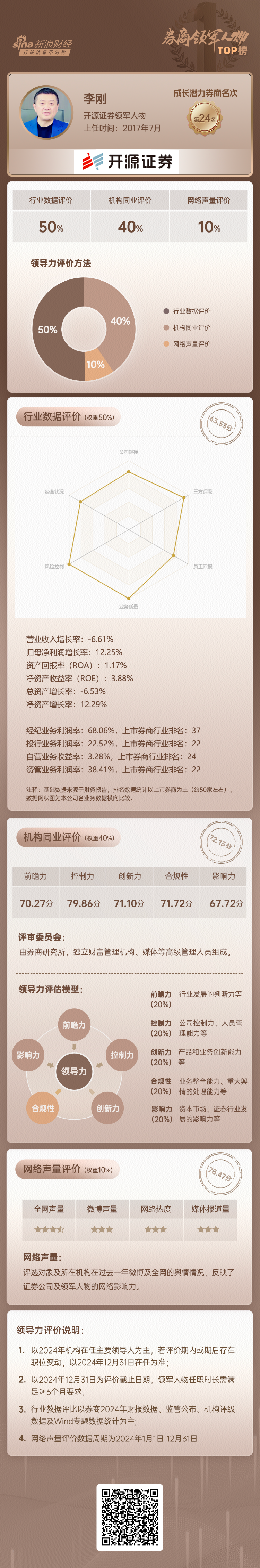 2024年,李刚先生领导下的开源证券综合评分位于成长发展券商第24名,而其中行业数据评价与网络声量评价分数相对较低。分维度来看: