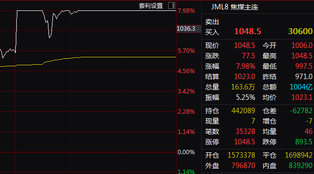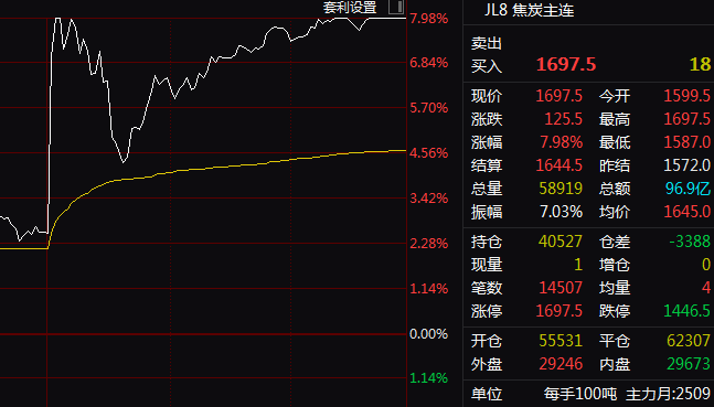 7月22日,国内期货市场黑色系再度领涨,午后,焦煤、焦炭、多晶硅等多种商品价格报出涨停。截至下午收盘,主力合约中焦煤、焦炭收于涨停,涨幅均为7.98%,玻璃涨9%,多晶硅涨8.99%,工业硅涨5.98%,纯碱涨8.01%,氧化铝也涨超6%。