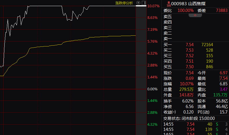 截至下午收盘,Wind煤炭指数涨6.45%,山西焦煤、昊华能源(601101)、潞安环能(601699)、山煤国际(600546)等多只个股收于涨停板。