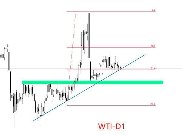 走势结构角度看,日线级别,美原油处于中期空头趋势,截至目前尚未由筑底迹象。短期趋势线如上图所示,目前市价正运行于趋势线附近。如果该趋势线被有效跌破,美原油可能迎来更大幅度的下跌。前一轮下跌波段的最低点超过上涨波段的0.618分位,多头动能较弱,存在转势可能。绿色区域是5月份原油的高点,一旦美原油进入新一轮下跌走势,该区域(63美元附近)有可能成为短期支撑。