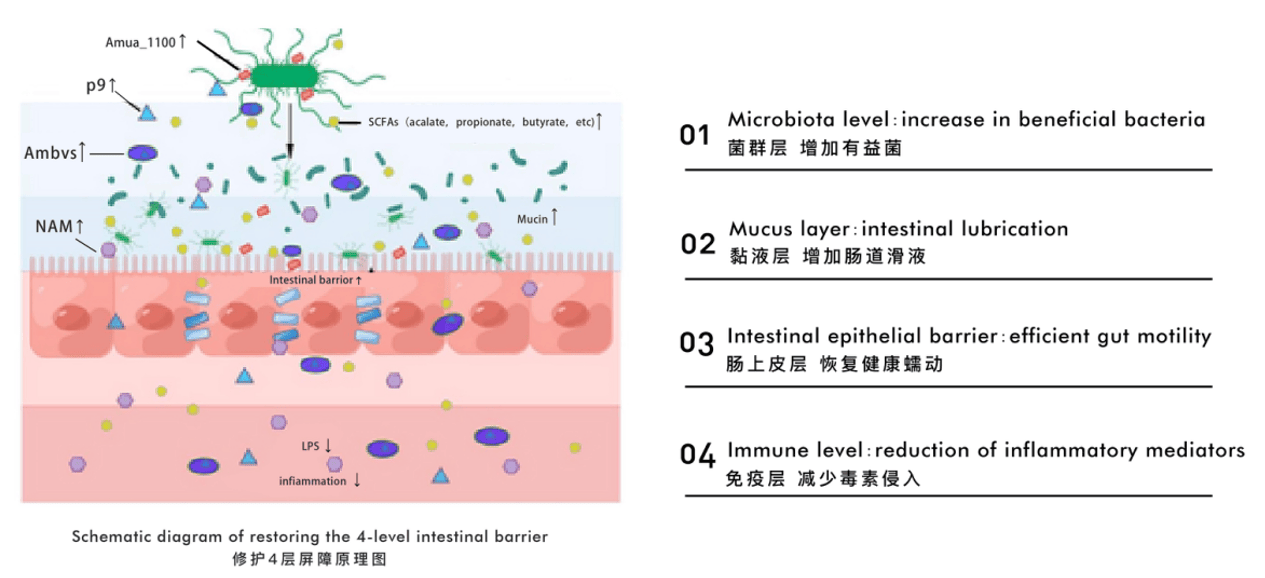 《Nature Reviews Gastroenterology and Hepatology》明确指出:“改善肠屏障是AKK菌诸多健康功效的基础核心。”作为占肠道菌群1%-5%的有益菌,多项研究证实,AKK菌能有效增强肠道屏障功能:通过增加肠道黏液层厚度、调节紧密连接蛋白,恢复肠粘膜通透性。进一步研究表明,它还能调节肠道生态平衡、降低肠道炎症反应,并有助于降低肠癌风险。