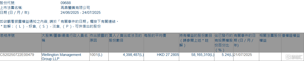 格隆汇7月24日丨根据联交所最新权益披露资料显示,2025年7月21日,再鼎医药(09688.HK)获Wellington Management Group LLP在场内以每股均价27.2805港元增持439.85万股,涉资约1.2亿港元。