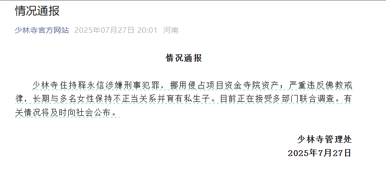 7月27日晚间,少林寺官方网站官微发布通报,少林寺住持释永信涉嫌刑事犯罪,挪用侵占项目资金寺院资产;严重违反佛教戒律,长期与多名女性保持不正当关系并育有私生子。目前正在接受多部门联合调查。有关情况将及时向社会公布。