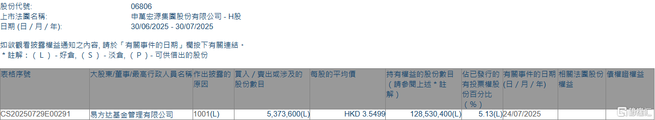 格隆汇7月30日丨根据联交所最新权益披露资料显示,2025年7月24日,申万宏源(06806.HK)获易方达基金管理有限公司在场内以每股均价3.5499港元增持537.36万股,涉资约1907.57万港元。