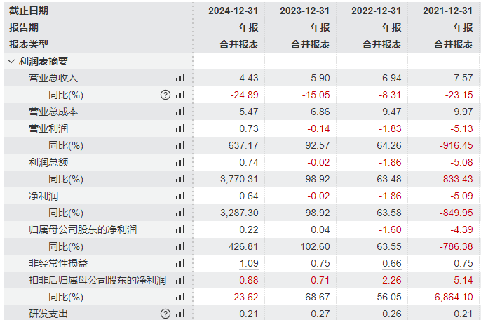 从业绩数据看,张小银的任期确实呈现“阶段性改善”:2022年(上任首年):扣非归母净亏损从2021年的5.14亿元收窄至2.26亿元;2023年:亏损进一步收窄至0.71亿元,逼近扭亏线;2024年:亏损却意外扩大至0.88亿元,改善趋势戛然而止。业绩波动暴露公司业务结构单一、行业周期敏感等深层问题,而财务总监的“节流”能力,难以抵消“开源”不足的短板。