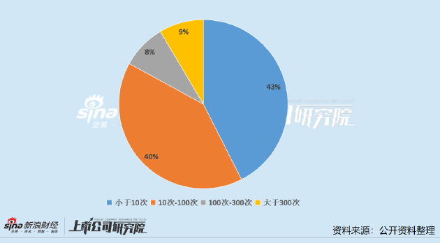从接待投资者次数看,各上市公司接待情况差异较大。经统计,年接待次数小于10次的公司数量为20家,占比43%;接待次数为10次-100次的公司数量为19家,占比40%;接待次数为100次-300次的公司数量为4家,占比8%;接待次数为300次-1000次的公司数量为4家,占比8%。