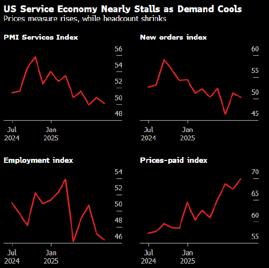 周二发布的这份数据报告描绘出高关税环境下服务业增长疲软的景象,除了关税外,消费者的谨慎情绪以及特朗普政策带来的不确定性都对服务业造成影响。