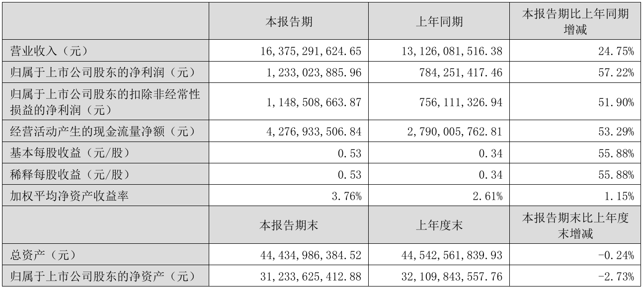鹏鼎控股(002938.SZ)发布2025年半年度报告。根据披露,上半年公司实现营业收入163.75亿元,同比增长24.75%;归属于上市公司股东的净利润12.33亿元,同比增加57.22%。营业收入增加系本期客户订单增加所致。