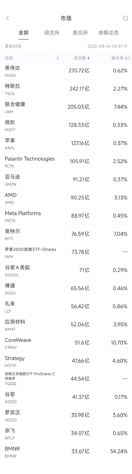 周五美股成交额第1名英伟达收跌0.86%,成交270.72亿美元。根据英伟达最新披露的13F文件,截至6月30日,英伟达将91.36%的公开持仓集中押注于AI云计算服务商CoreWeave,总投资额达39.6亿美元。除CoreWeave外,英伟达还持有其他多家AI相关公司的股份,包括Arm、Applied Digital等。