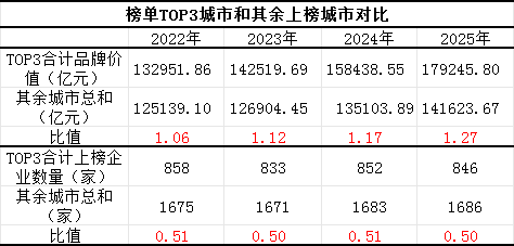 值得关注的是,品牌价值向头部城市集聚的趋势仍在强化。2025年,北京、深圳、上海的品牌价值总和与其余TOP100城市总和之比为1.27,高于2022年的1.06。