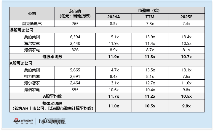聚焦估值水平,奥克斯电气的定价未充分体现与行业龙头的基本面差距,整体估值预计处于偏高区间。按“价格区间中端、发售量调整权未行使、绿鞋全额行使”计算,公司发行市值约为265亿港元,对应2024年市盈率(2024A)、最近12个月市盈率(TTM)分别为8.3倍、7.8倍;参考家用电器指数(882449.WI)2025年归母净利润平均增速12.59%,公司2025年预测市盈率(2025E)约为7.4倍。