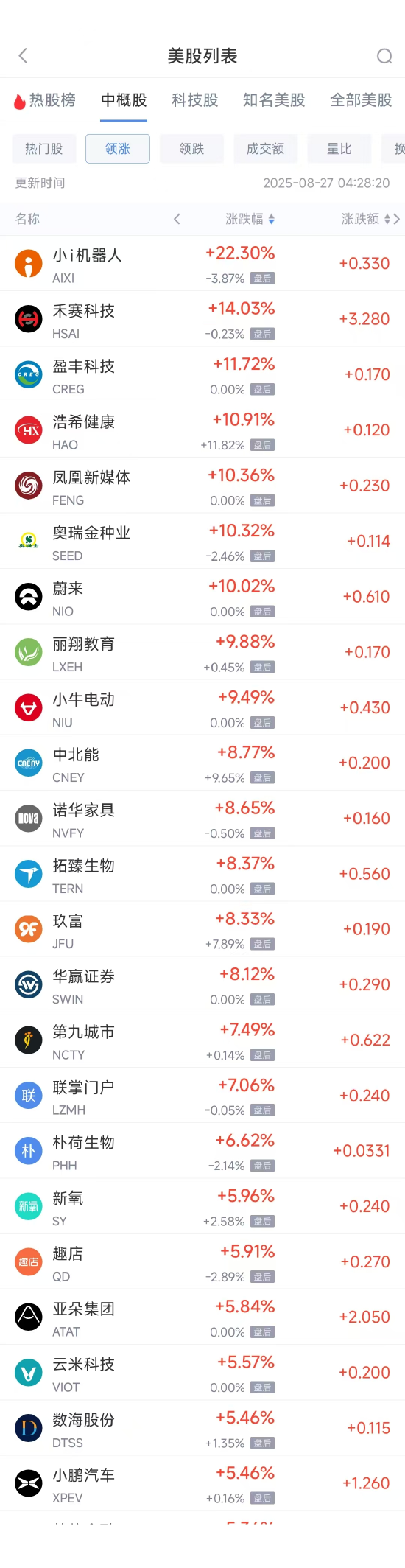 领涨中概股列表: