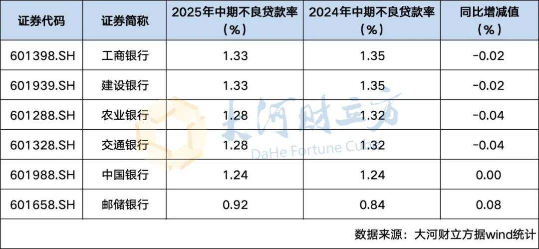 今年上半年,六大行资产质量持续向好,平均不良贷款率为1.23%,较行业平均值低0.26个百分点,发挥着金融稳定“压舱石”的作用。其中,农业银行、交通银行、工商银行、建设银行不良率,较去年同期降低了0.02~0.04个百分点;中国银行与去年同期持平,为1.24%;邮储银行虽较去年同期增加了0.08个百分点,但仍以0.92%的不良率居六大行最低。