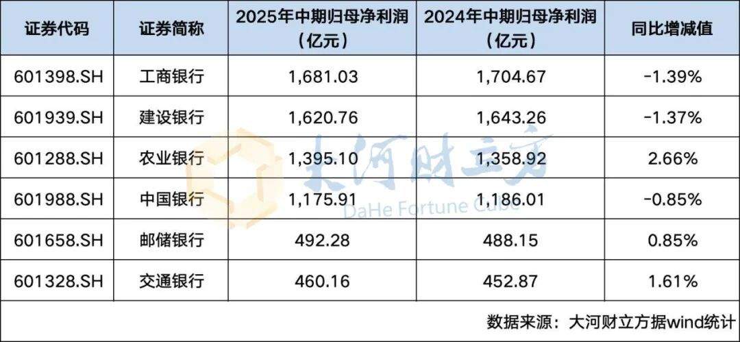【大河财立方 记者 裴熔熔】8月29日晚间,国有六大行年中成绩单披露完毕。