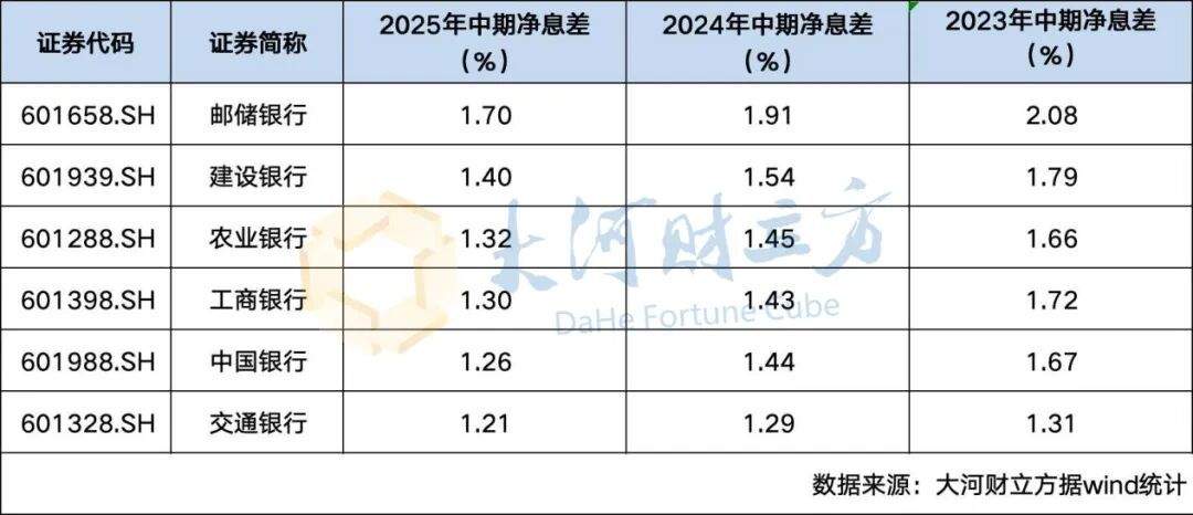 值得一提的是,邮储银行虽今年中期净息差收窄幅度最大,为0.21个百分点,但仍以1.70%位居六大行首位。