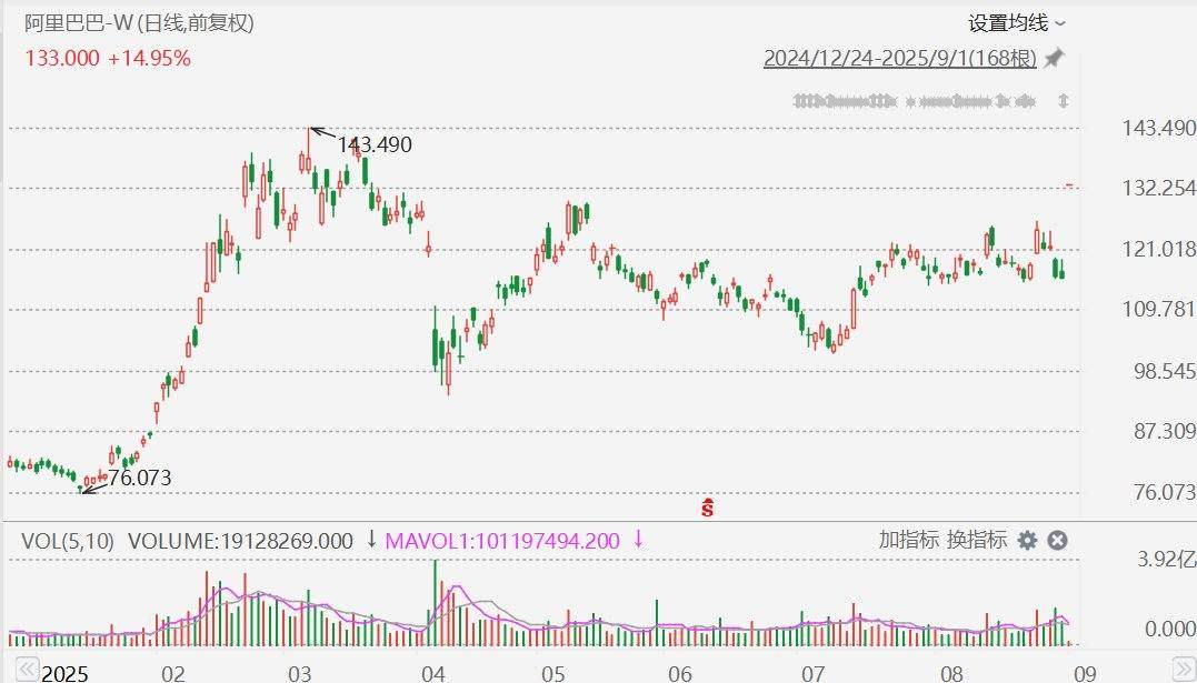 格隆汇9月1日|阿里巴巴(9988.HK)高开14.95%,报133港元,创3月以来新高;美股市场阿里巴巴上周五收涨12.9%,报135美元,折算成港股市场价格为131.53港元/股。