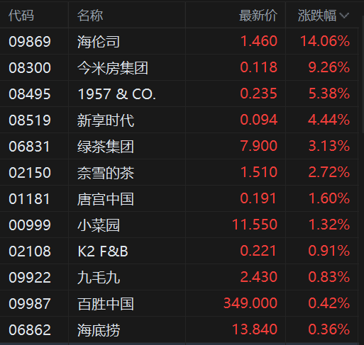 港股餐饮股普遍拉升,尤其是海伦司绩后涨超14%表现十分抢眼,奈雪的茶涨近3%,小菜园、九毛九、百胜中国、海底捞均有涨幅。