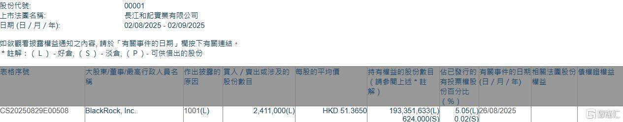 格隆汇9月2日丨根据联交所最新权益披露资料显示,2025年8月26日,长和(00001.HK)获BlackRock, Inc.在场内以每股均价51.365港元增持好仓241.1万股,涉资约1.24亿港元。
