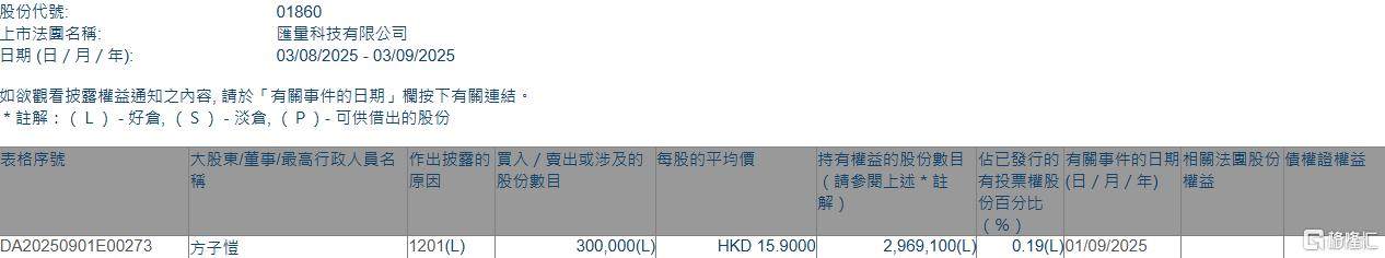 格隆汇9月3日丨根据联交所最新权益披露资料显示,2025年9月1日,汇量科技(01860.HK)遭执行董事方子恺在场内以每股均价15.90港元减持30万股,涉资约477万港元。